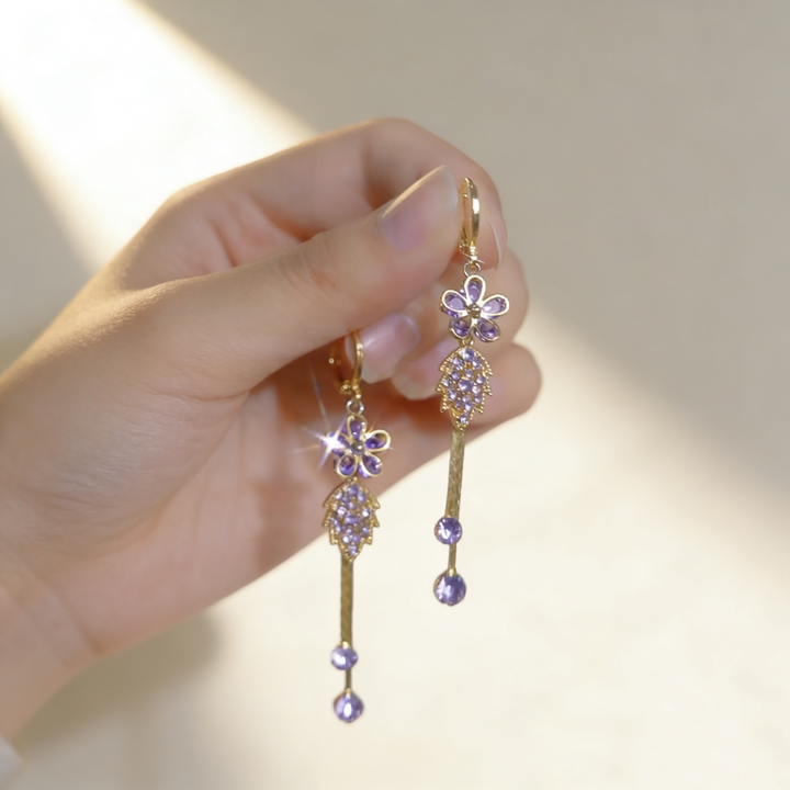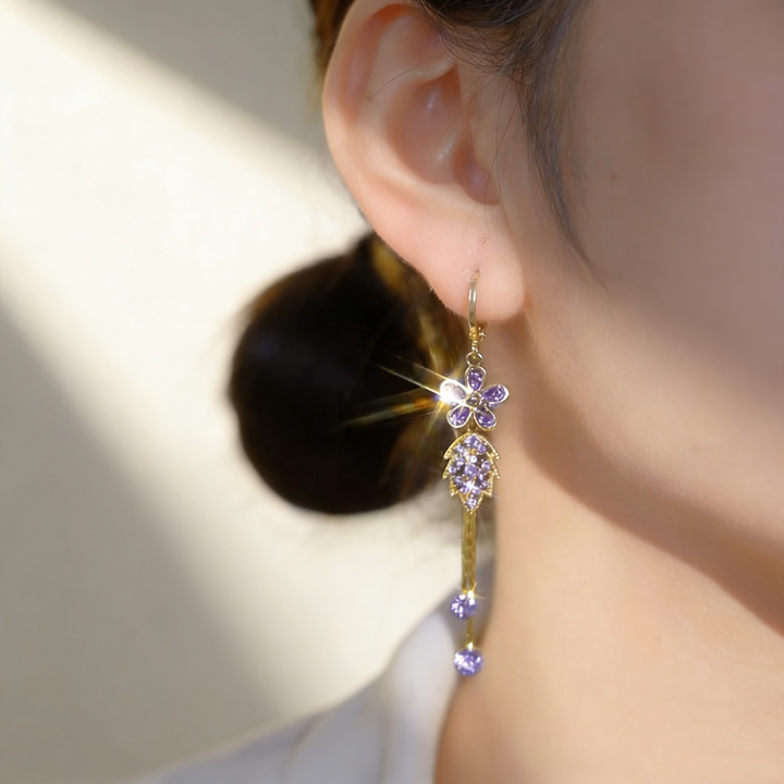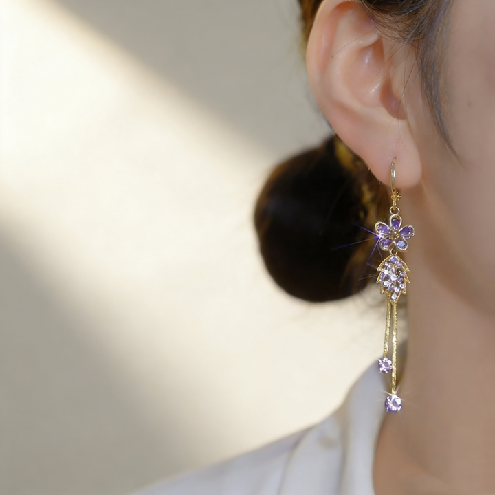 A graceful pair of double-layer tassel earrings featuring delicate floral motifs crafted with purple Cubic Zirconia. Each earring showcases a sparkling purple flower paired with an elegant leaf design, brought together in a cascading silhouette that sways beautifully with every movement. Made with S925 sterling silver and finished with 18K gold plating, this piece blends feminine charm with luminous sparkle—perfect for elevating daily outfits, gifting, or adding elegance to dates, work, and special occasions.
