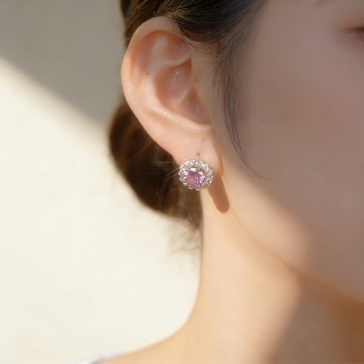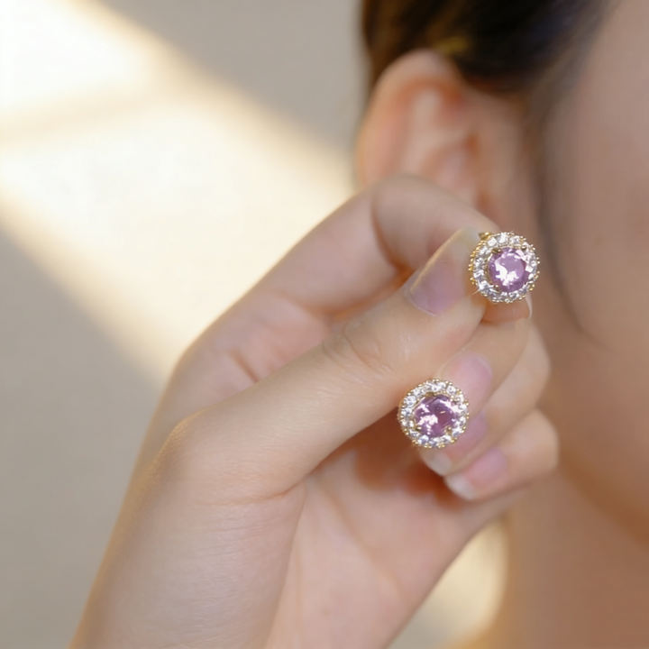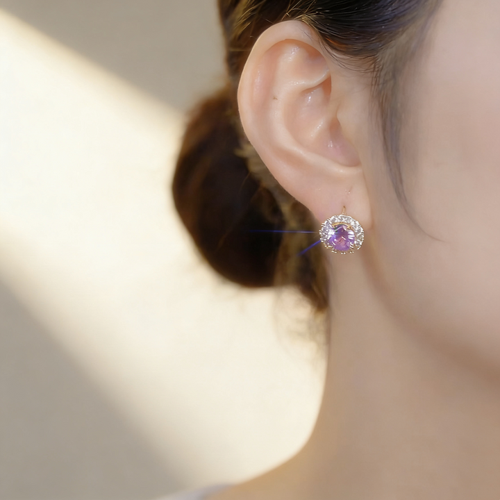 A refined pair of earrings featuring a single Amethyst as the main stone, beautifully surrounded by a sparkling halo of Cubic Zirconia (Simulated Diamond). Crafted in S925 silver with 18K gold plating, this elegant design highlights rich color, delicate brilliance, and timeless feminine charm—perfect for enhancing daily outfits, thoughtful gifting, or adding sophistication to dates, work, and special occasions.