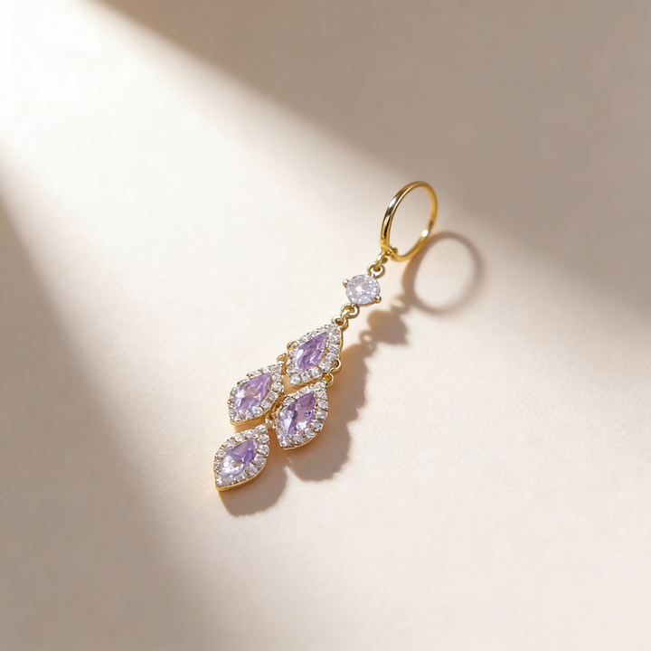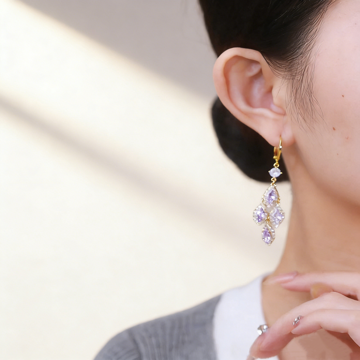A graceful pair of earrings featuring four diamond-shaped purple amethysts (Purple Cubic Zirconia) as the main stones, each surrounded by a delicate halo of Cubic Zirconia (Simulated Diamond). Crafted in S925 silver with 18K gold plating, these earrings combine elegance and movement, perfect for daily wear, gifting, or adding a touch of sophistication to dates, work, and special occasions.