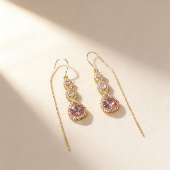 A graceful pair of tassel threader earrings featuring a central purple Cubic Zirconia stone paired with two sparkling Cubic Zirconia (Simulated Diamond) accents. Additional pavé-set stones enhance the flowing design, creating an elegant, luminous look with every movement. Crafted in 925 sterling silver with 18K gold plating, these earrings add refined sparkle and modern charm—perfect for elevating daily outfits, gifting to someone special, or enhancing dates, work, and special events.