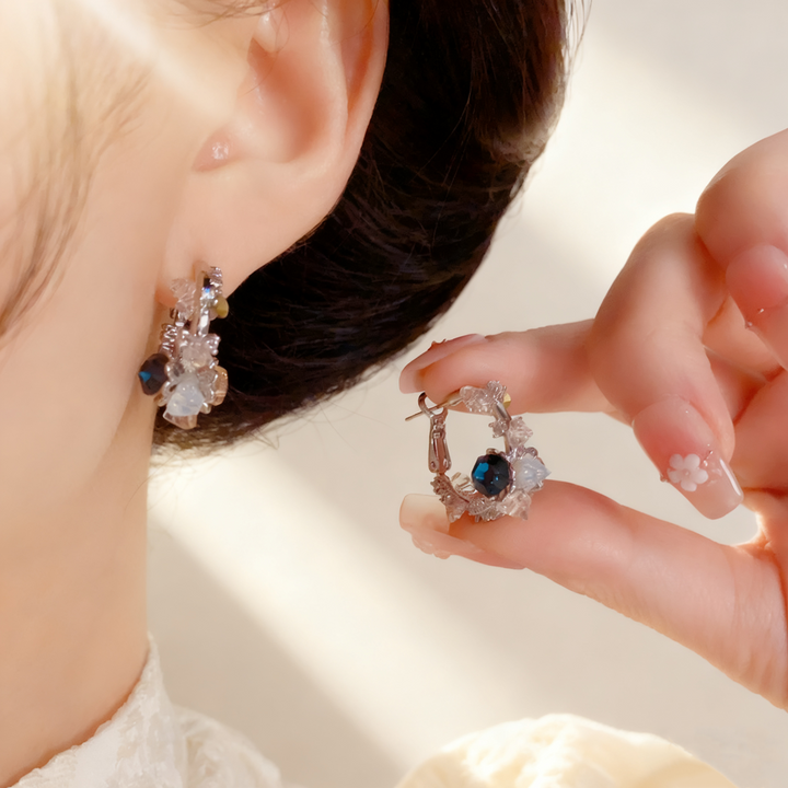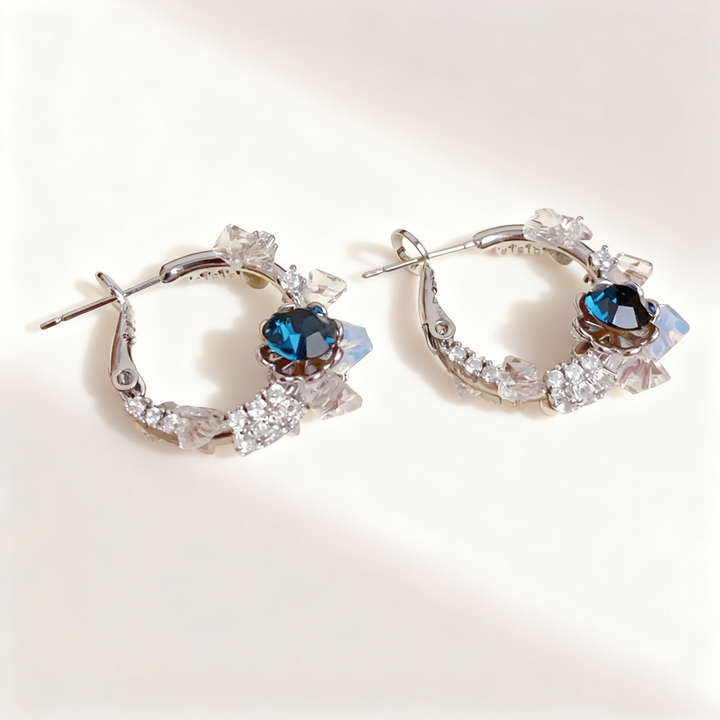 A stunning pair of earrings featuring a central blue Cubic Zirconia accented with sparkling Cubic Zirconia (Simulated Diamond). Crafted in S925 silver with 18K gold plating, these earrings offer timeless elegance and refined sparkle—perfect for enhancing daily outfits, gifting to someone special, or adding sophistication to dates, work, and special occasions.