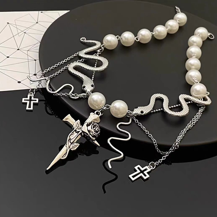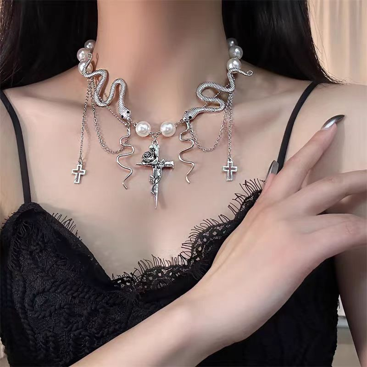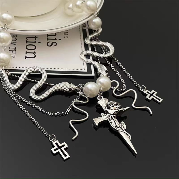 Transform your look with our elegant Cross Pearl Snake Tassel Necklace. Featuring a unique design of a cross and snake, embellished with pearls and finished with a delicate tassel, this necklace adds a touch of sophistication to any outfit. Elevate your style and make a statement with our one-of-a-kind piece.