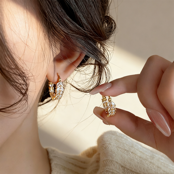 A refined and elegant pair of earrings inspired by the graceful shape of wheat ears, fully crafted with shimmering Cubic Zirconia (Simulated Diamond). Set in 925 sterling silver with 18K gold plating, the design captures the symbolism of harvest, abundance, and good fortune. The sleek, elongated silhouette enhances the facial lines and brings a gentle sparkle that elevates both daily looks and special-occasion outfits. Perfect for everyday wear, thoughtful gifting, and adding sophistication to dates, work, or events.