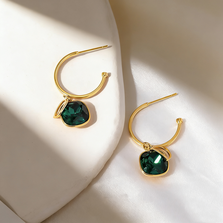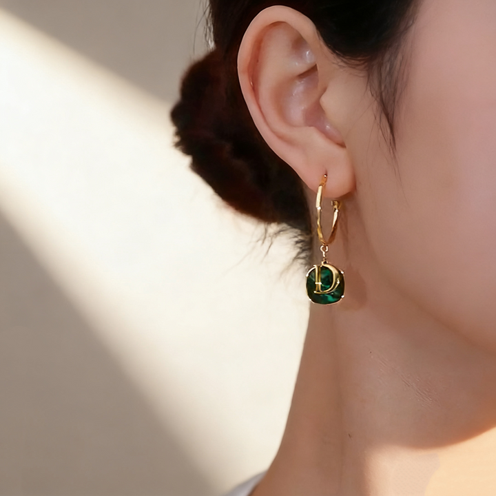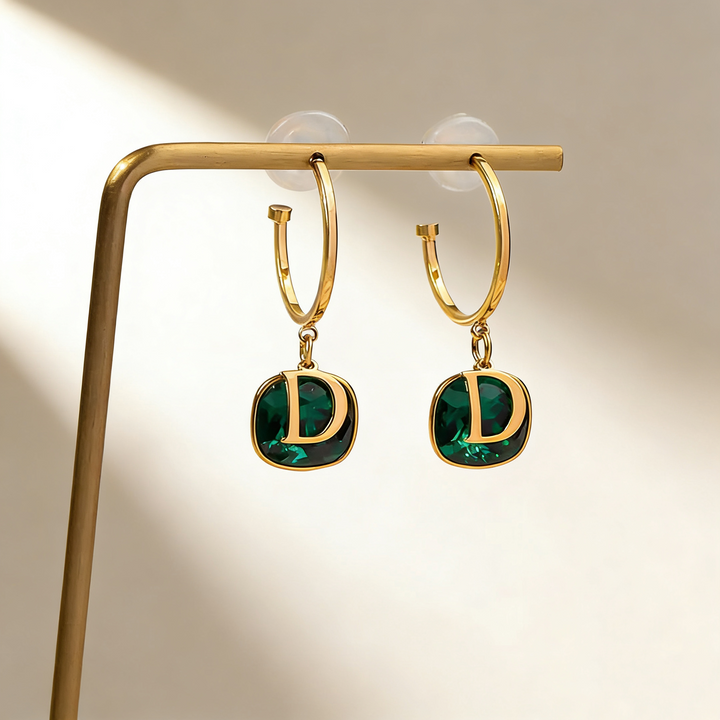 A unique and stylish pair of earrings featuring a central emerald gemstone, complemented by a second layer with the letter "D" design, adding a touch of sophistication and modern charm. Crafted in S925 silver with 18K gold plating, these earrings are perfect for adding an elegant flair to both daily outfits and special occasions, such as dates, work, or events.