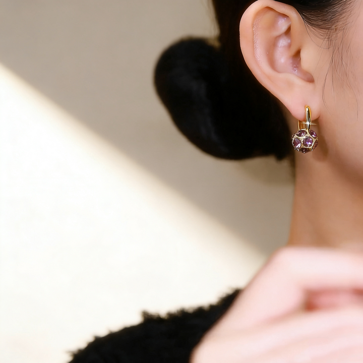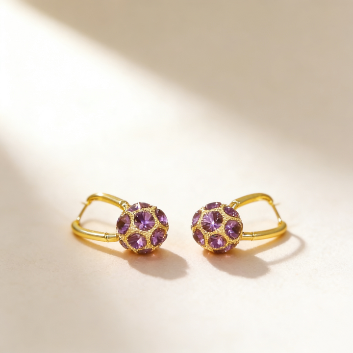 A stunning pair of earrings featuring a ball-shaped design fully paved with purple Cubic Zirconia, creating a dazzling and elegant look. Crafted in S925 silver with 18K gold plating, these earrings add a refined sparkle to daily outfits, gifting occasions, or special events such as dates, work, and parties.