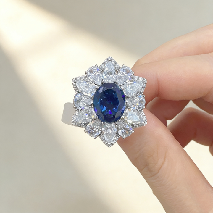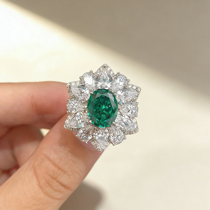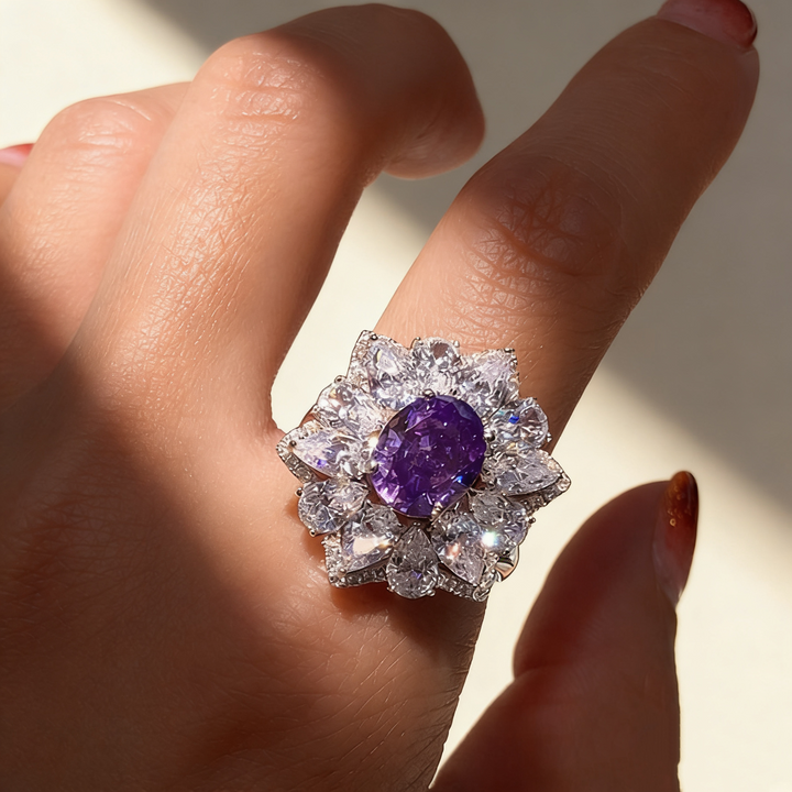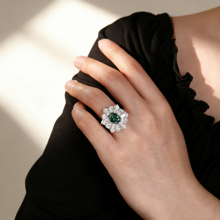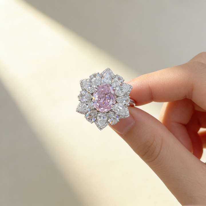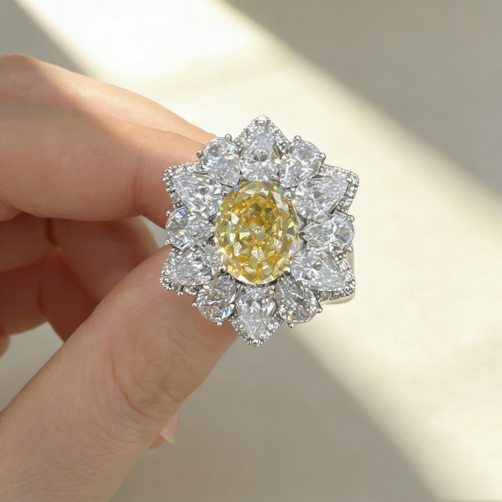 A dazzling ring featuring an exquisite Ice Flower-cut Moissanite as the centerpiece, available in a variety of colors including Yellow, Pink, Purple, Blue, Green, Emerald Green, and Sky Blue. Set in S925 silver with luxurious 18K white gold plating, this ring is accented with smaller pavé-set Moissanite stones to enhance brilliance and sparkle. Its unique cut and vibrant color options make it perfect for daily wear, romantic dates, office settings, parties, or as a thoughtful gift.