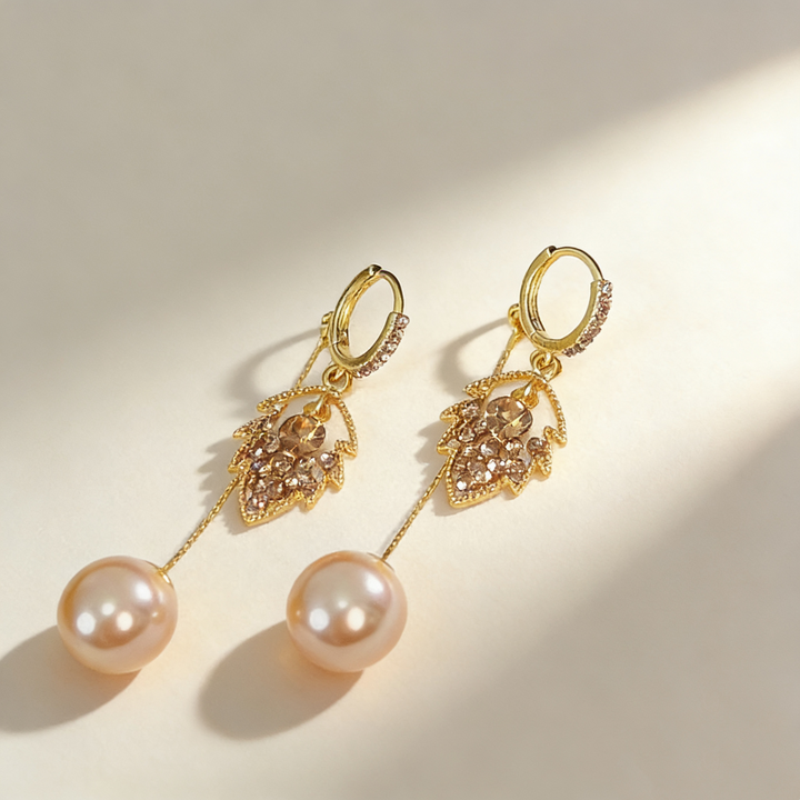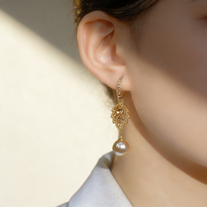 A graceful pair of earrings featuring an elegant hollow leaf design, delicately adorned with Cubic Zirconia (Simulated Diamond) to create a refined sparkling texture. A flowing tassel design is paired with a luminous pearl, adding movement, softness, and timeless charm. Crafted in S925 silver with 18K gold plating, these earrings effortlessly elevate everyday looks while bringing sophistication to dates, work, and special occasions. They also make a thoughtful and stylish gift.