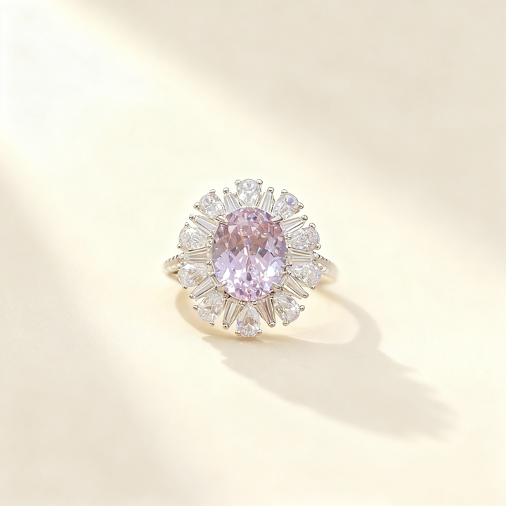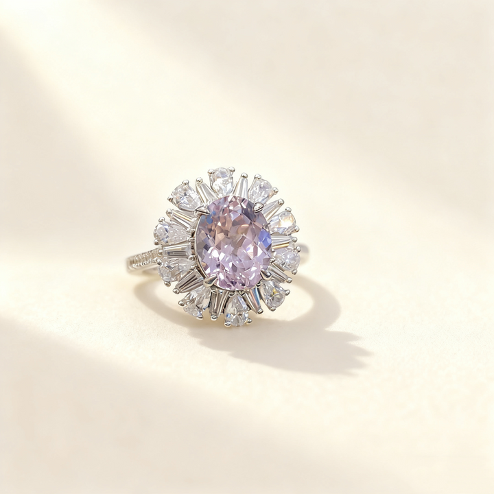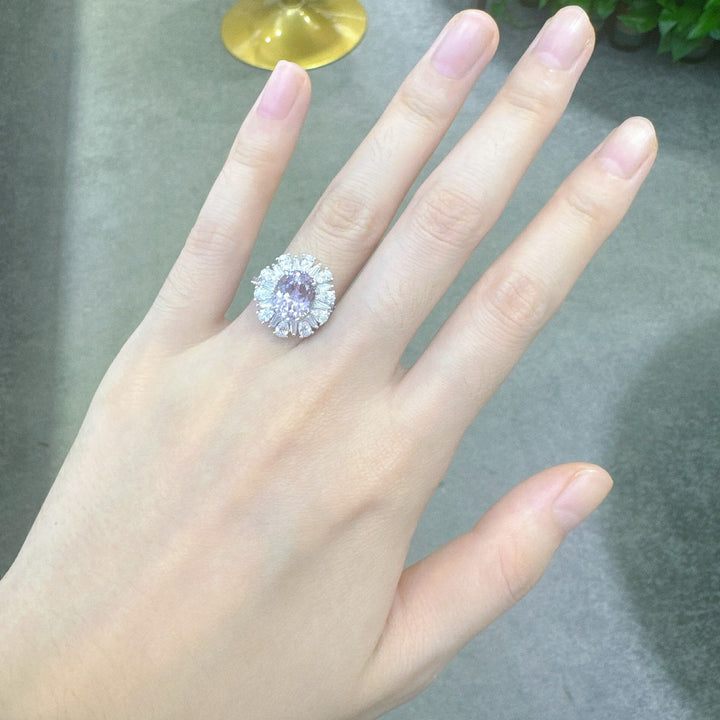 An elegant ring featuring a 3ct light purple oval-cut Moissanite as the centerpiece, complemented by smaller pavé-set white Moissanite accent stones. Crafted in S925 silver with luxurious 18K white gold plating, this ring offers a sophisticated and feminine touch, perfect for daily wear or special occasions.