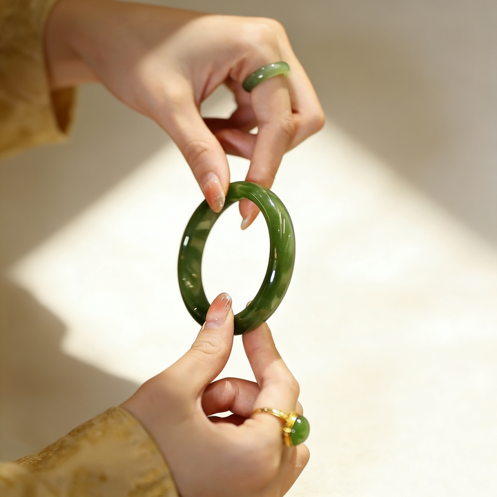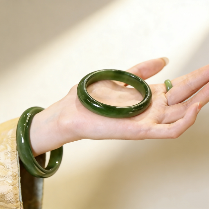 Each bangle is carved and polished from natural jade, and slight variations in color or texture are part of its unique charm.