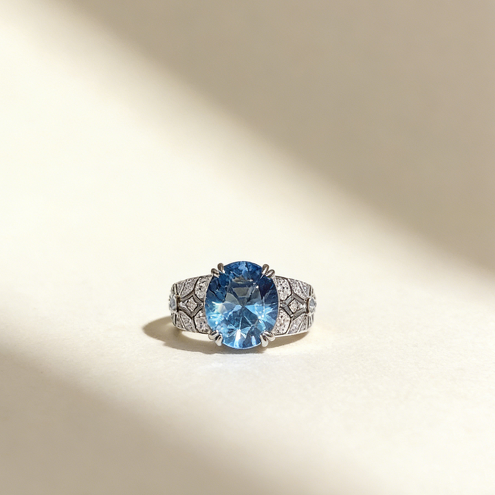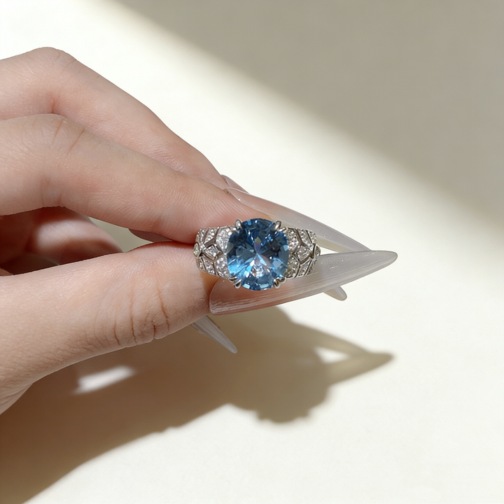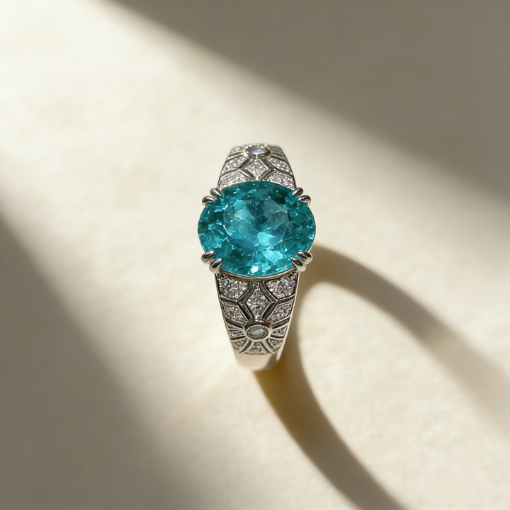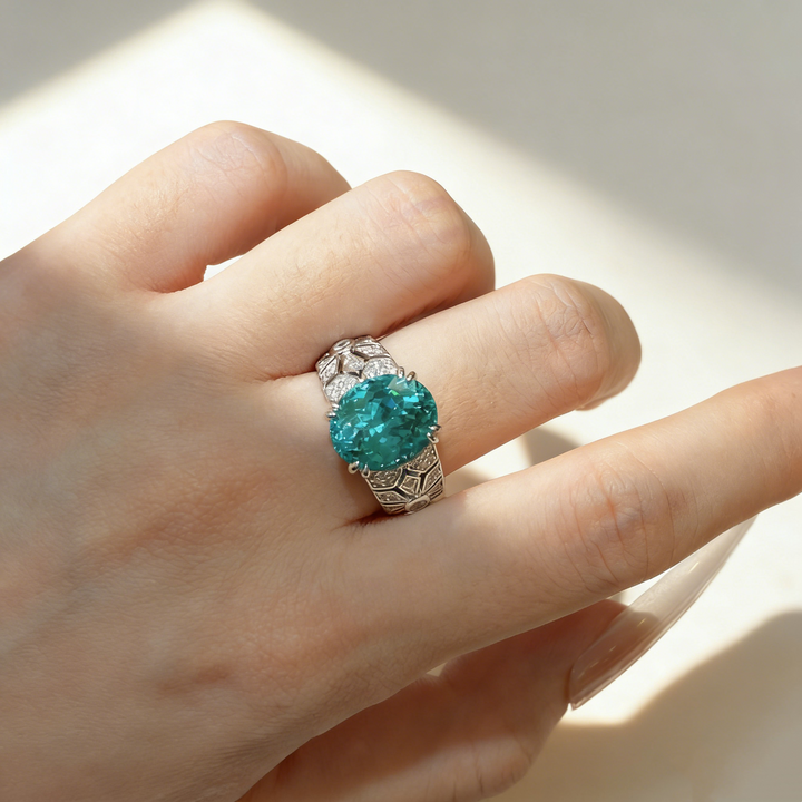 A stunning ring featuring a captivating 6-carat oval-cut lab-grown Paraiba gemstone, available in two vibrant color options: Paraiba Blue and Aquamarine Blue. Set in S925 silver with luxurious 18K white gold plating, this piece is elegantly accented with small pavé-set Moissanite stones for added brilliance. Its vivid color, refined craftsmanship, and timeless silhouette make it perfect for daily wear, work, dates, parties, or gifting.