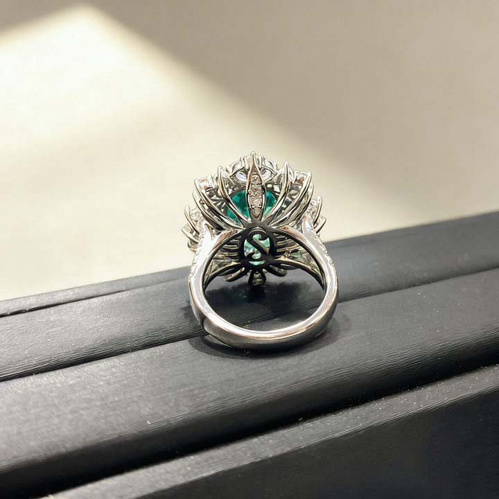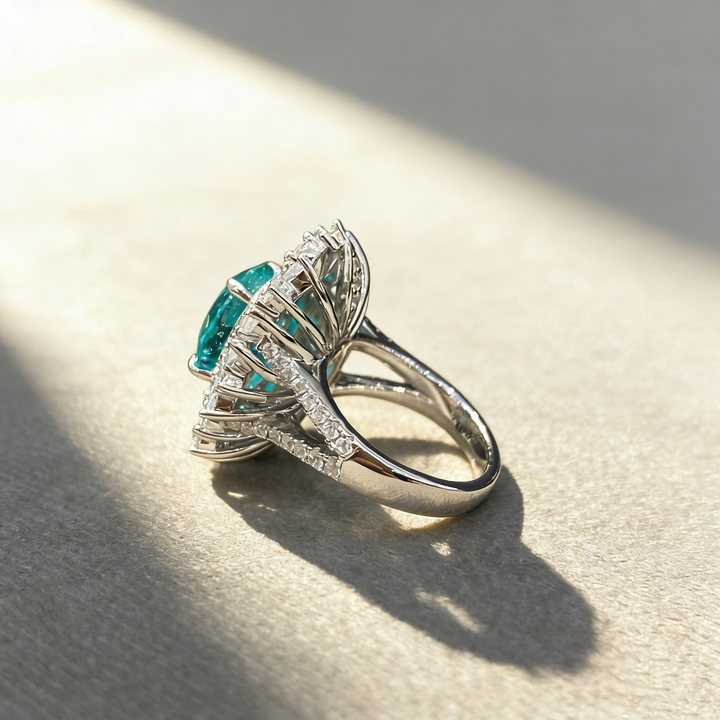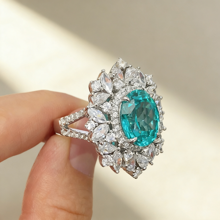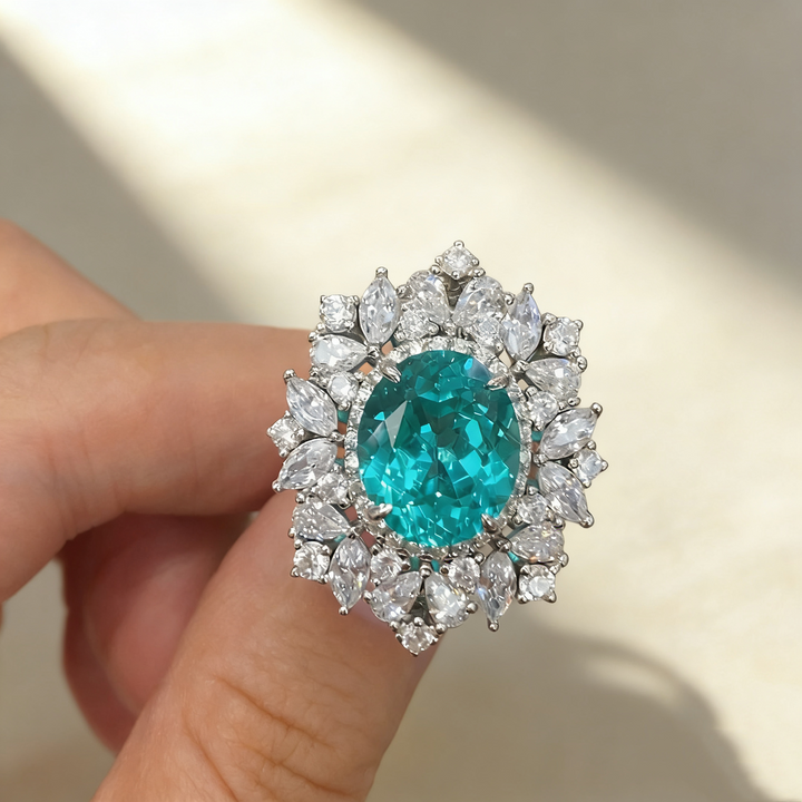 A stunning statement ring featuring a 6ct Paraiba-colored oval-cut Moissanite as the centerpiece, complemented by smaller pavé-set white Moissanite accent stones. Crafted in S925 silver with luxurious 18K white gold plating, this ring captures the vibrant, tropical glow of Paraiba gemstones. Its elegant yet bold design makes it perfect for daily wear, office settings, romantic dates, parties, or as a thoughtful gift for someone special.