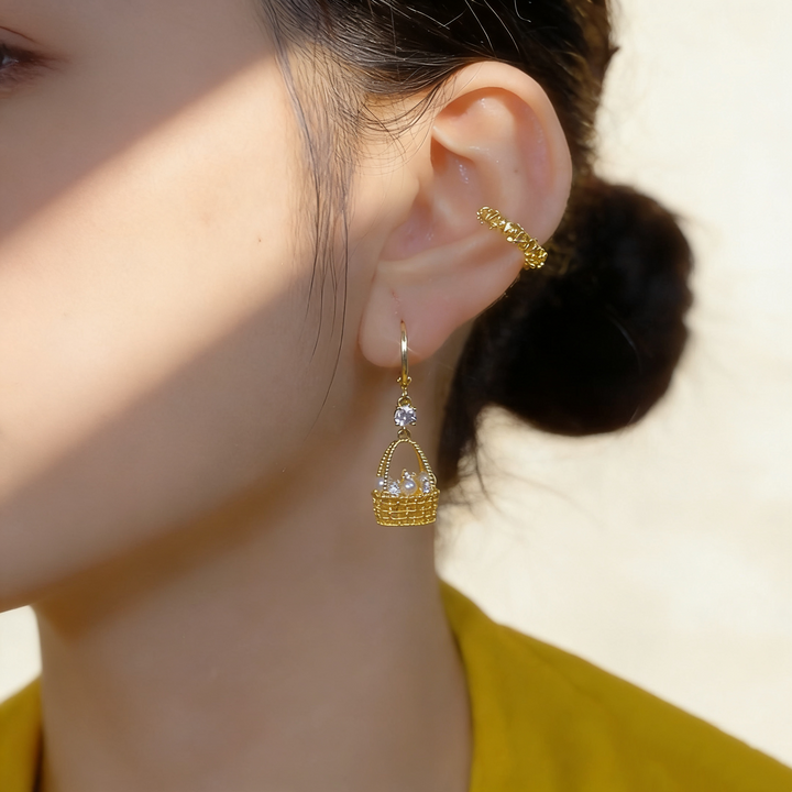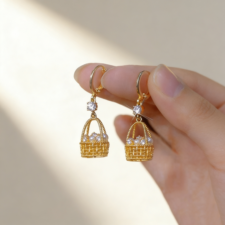A charming pair of earrings inspired by a golden flower basket filled with jewels. Each basket is adorned with radiant Cubic Zirconia (Simulated Diamond) and luminous pearls, creating a sweet yet luxurious design. Perfect for daily elegance, thoughtful gifting, and adding a soft romantic touch to any outfit.