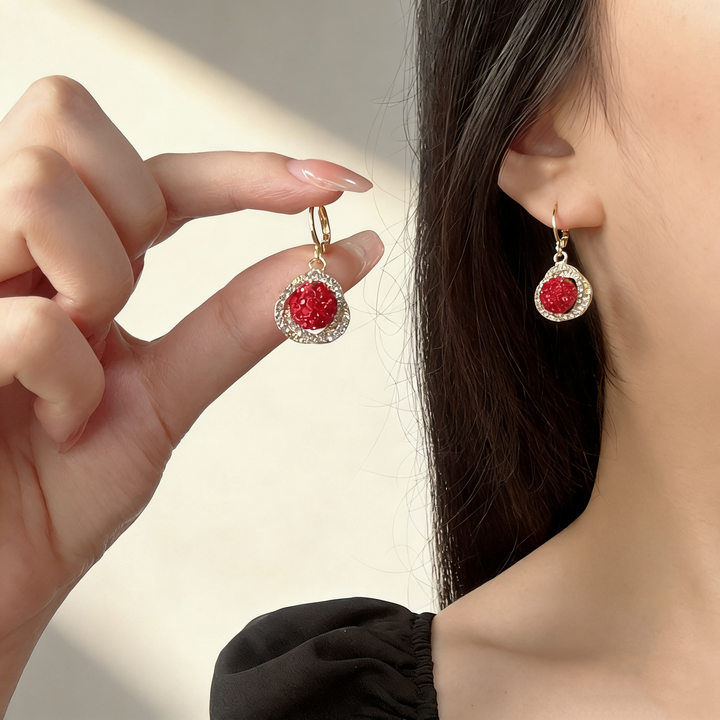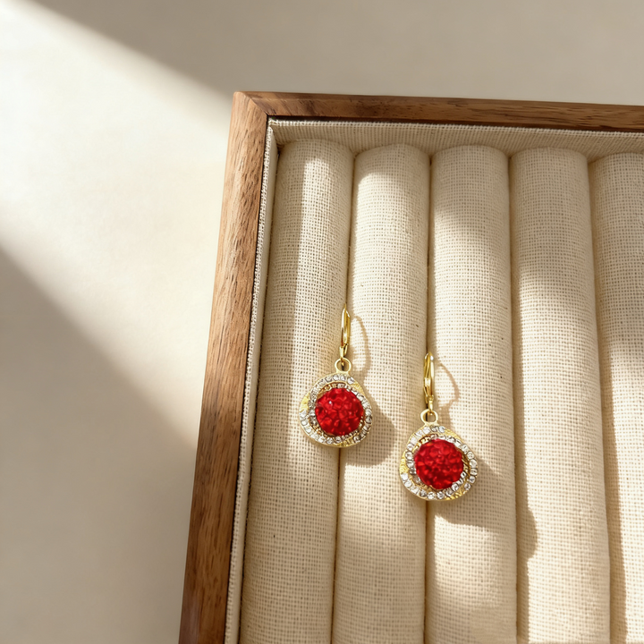 A striking pair of earrings featuring two gold-toned, Cubic Zirconia (Simulated Diamond)–encrusted hoops elegantly wrapped together, creating a flowing, sculptural silhouette. At the center rests a brilliant sphere made of red Cubic Zirconia, adding a bold pop of color and luxurious sparkle. Crafted in 925 silver with 18K gold plating, these earrings balance modern design with timeless shine—perfect for elevating daily looks, gifting, or complementing outfits for dates, work, and special events.