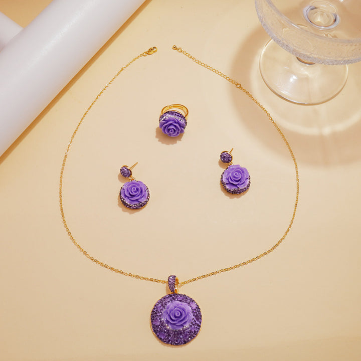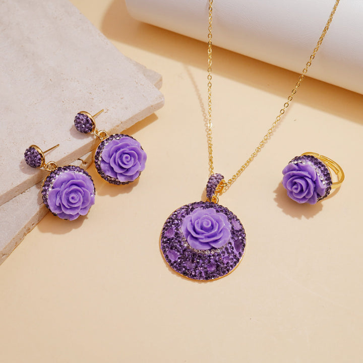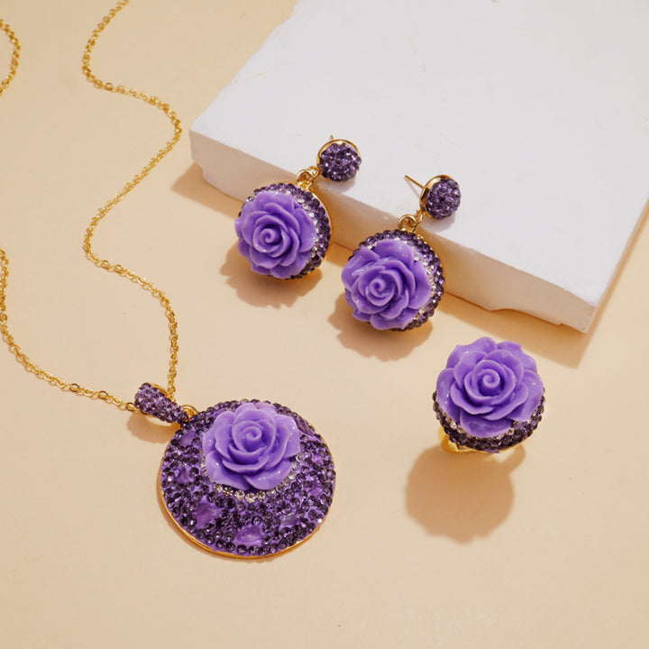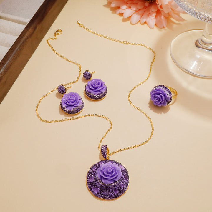 Elegantly crafted rose flower jewelry set featuring matching earrings, ring, and necklace. Each piece showcases intricate floral detailing with precision metalwork that captures the delicate beauty of roses. This coordinated set offers versatility for both formal occasions and everyday sophistication, allowing for a cohesive aesthetic whether worn together or as individual statement pieces.