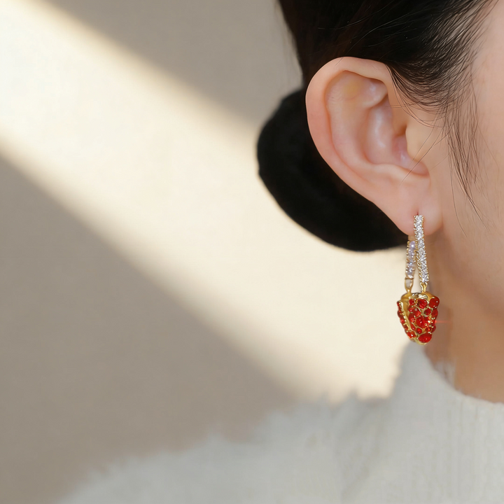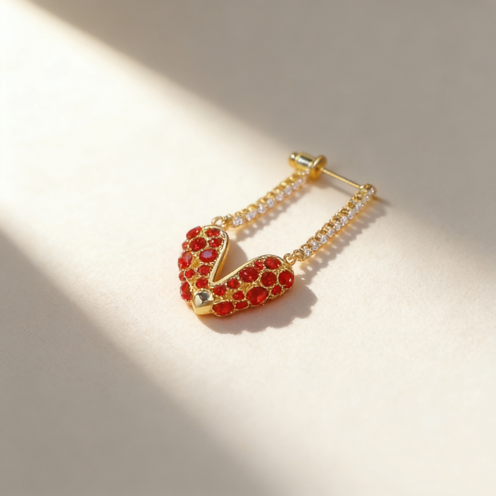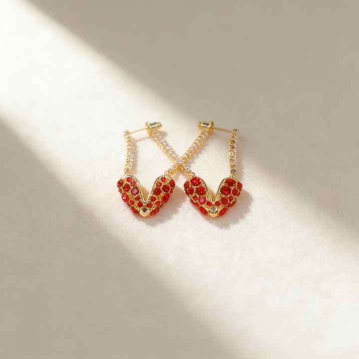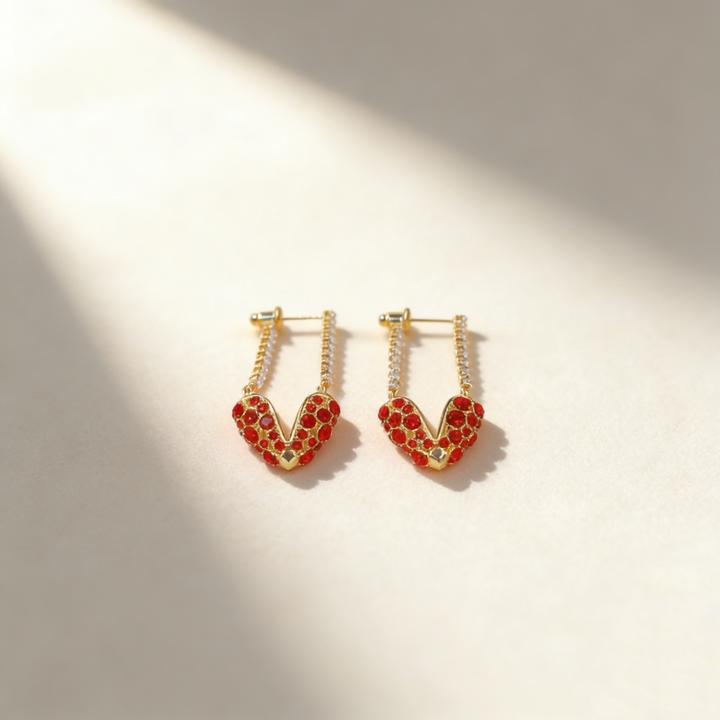 A romantic pair of earrings featuring a heart design fully paved with red Cubic Zirconia, creating a sparkling and elegant look. Crafted in S925 silver with 18K gold plating, these earrings add a refined touch to daily outfits, gifting occasions, or special events such as dates, work, and parties.