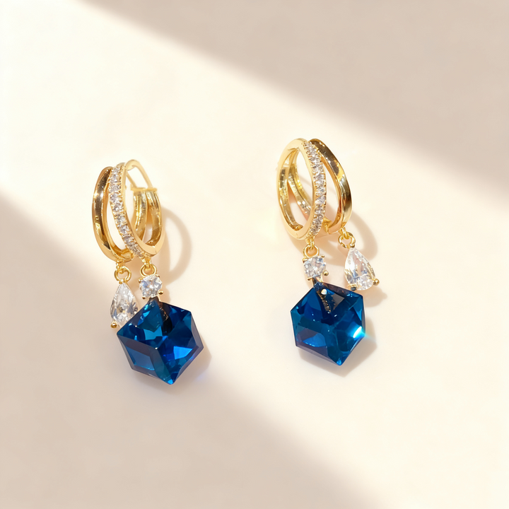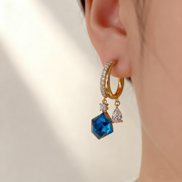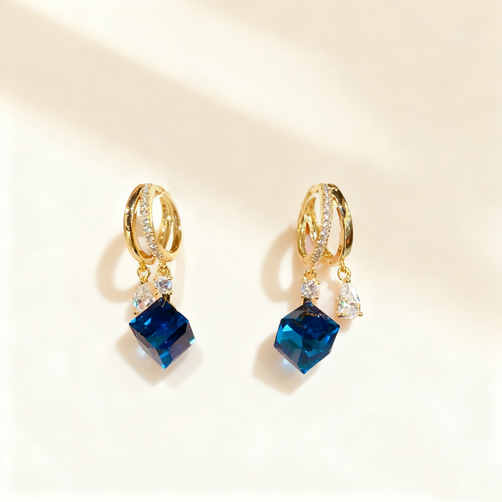 A stylish pair of double-layer earrings featuring cube-shaped Blue Sapphire as the main stone, accented with sparkling Cubic Zirconia (Simulated Diamond) for added brilliance. Crafted in S925 silver with 18K gold plating, this elegant design combines geometric sophistication with refined sparkle—perfect for enhancing daily outfits, gifting to someone special, or adding charm to dates, work, and special occasions.