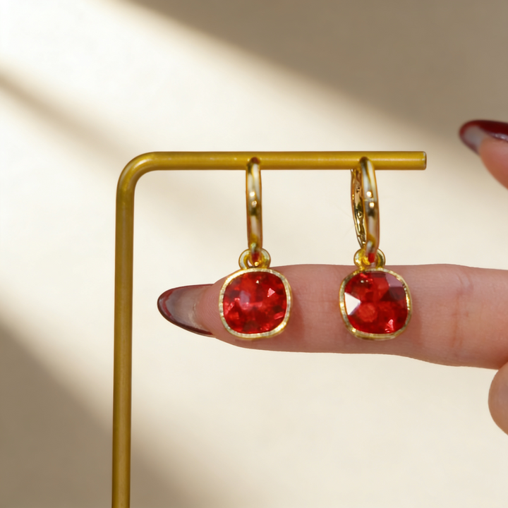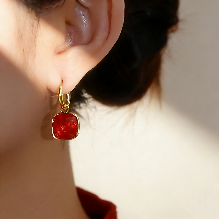 A sophisticated pair of earrings featuring a square-shaped ruby as the main stone, offering a modern and elegant look. Set in S925 silver with 18K gold plating, these earrings are a timeless piece that can elevate both daily outfits and special occasion looks. Perfect for adding a touch of color and sophistication to dates, work, or formal events.