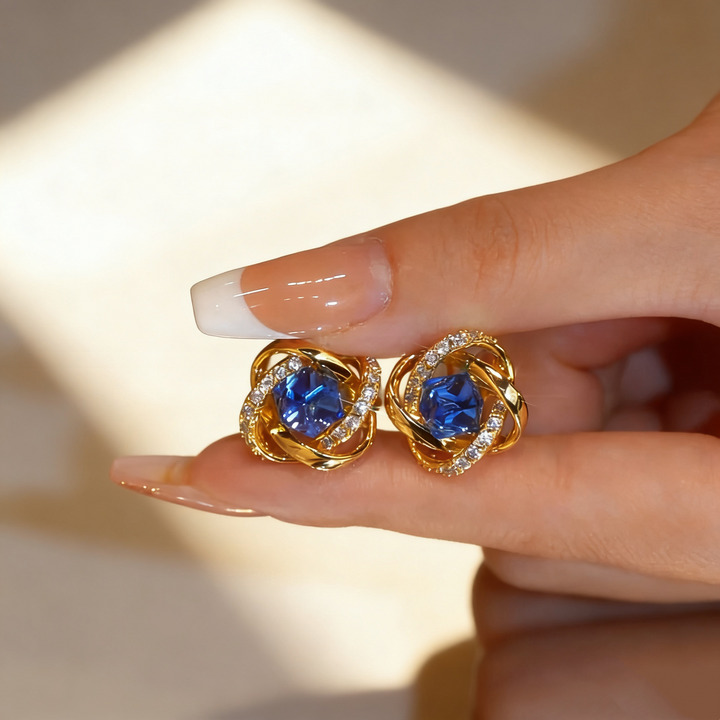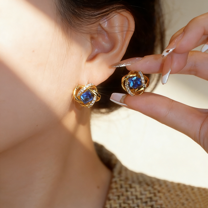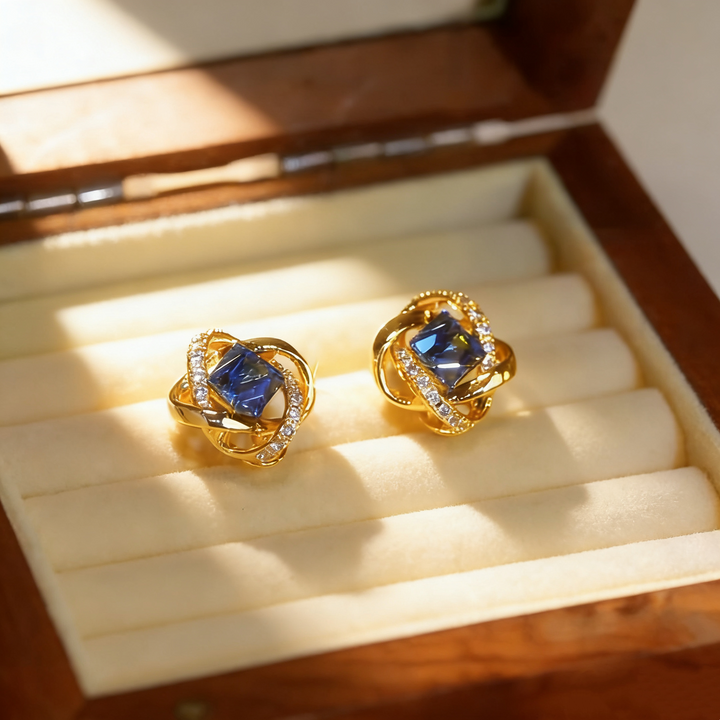 A stylish pair of earrings featuring a cubic blue sapphire as the main stone, delicately wrapped with sparkling Cubic Zirconia (Simulated Diamond). Crafted in S925 silver with 18K gold plating, these earrings bring a modern, elegant flair to daily outfits or formal occasions, offering a chic and sophisticated look for work, dates, or special events.