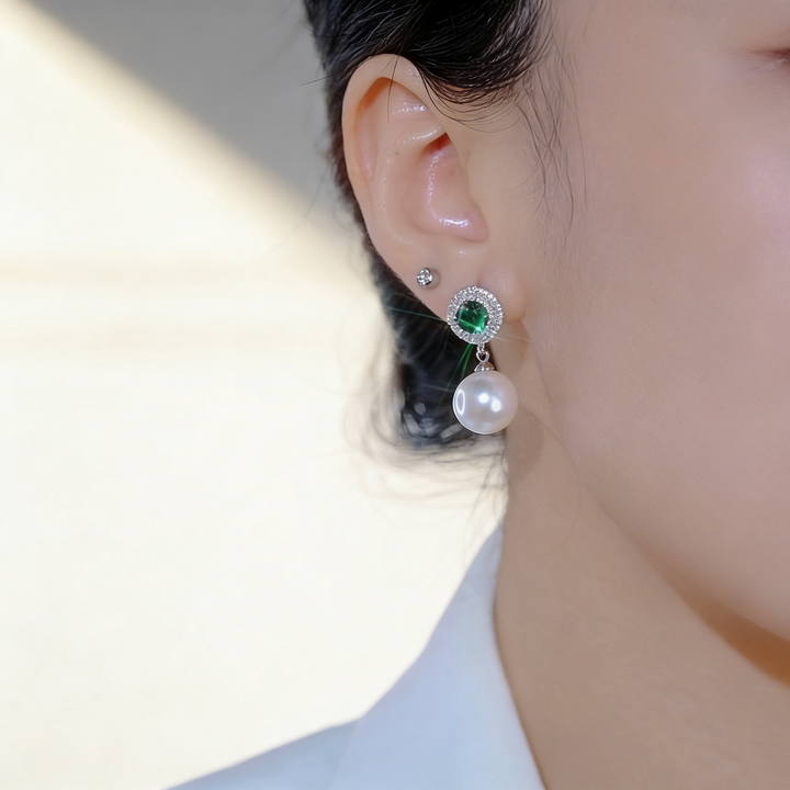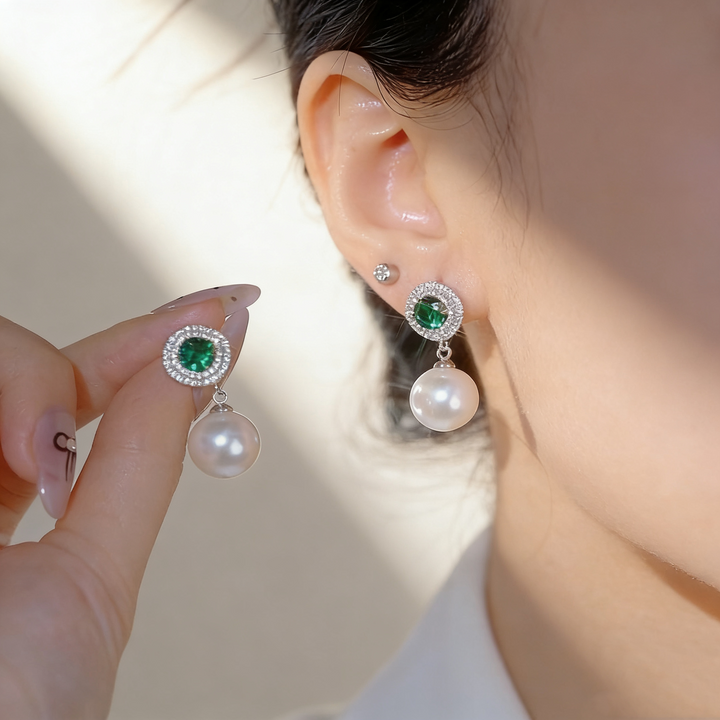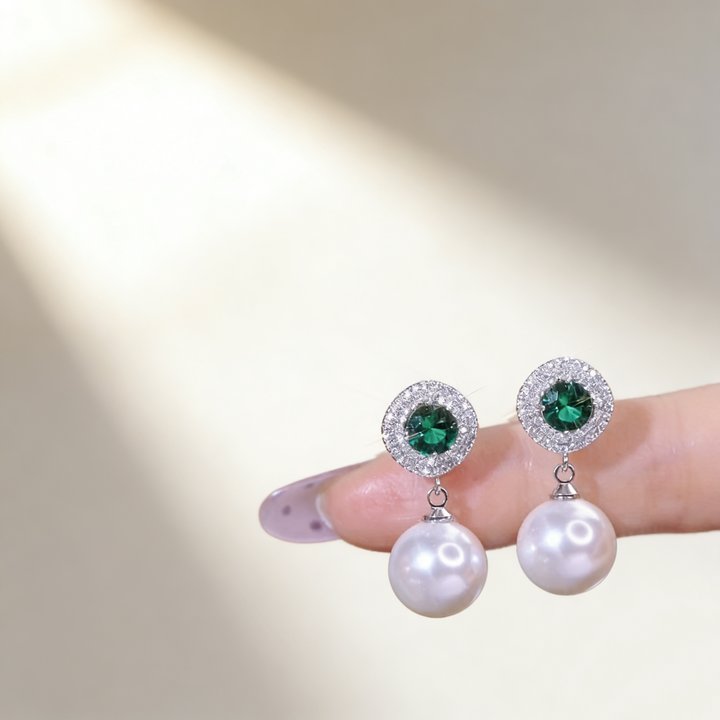 A timeless pair of earrings featuring a green emerald gemstone (Green Cubic Zirconia) as the main stone, surrounded by a delicate halo of Cubic Zirconia (Simulated Diamond), with a classic pearl dangling below. Crafted in S925 silver, these earrings combine vintage elegance with a modern sparkle, making them perfect for both everyday wear and special occasions.