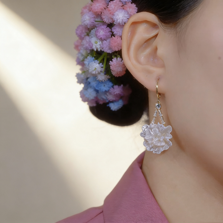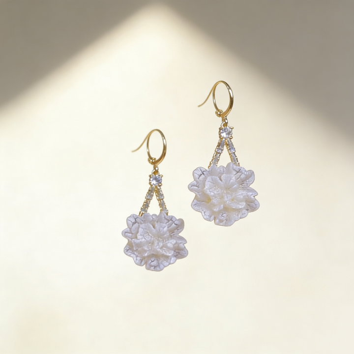 A delicate pair of earrings featuring a white camellia flower accented with sparkling Cubic Zirconia (Simulated Diamond). Crafted in S925 silver with 18K gold plating, these earrings add a touch of elegance and charm to daily outfits, gifting occasions, or special events such as dates, work, and parties.