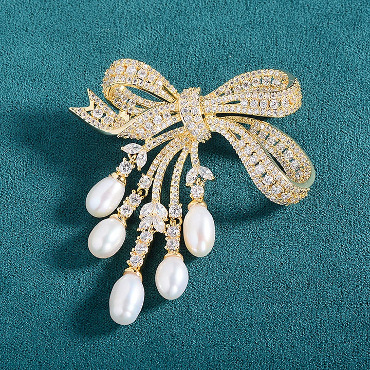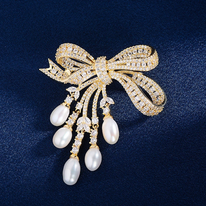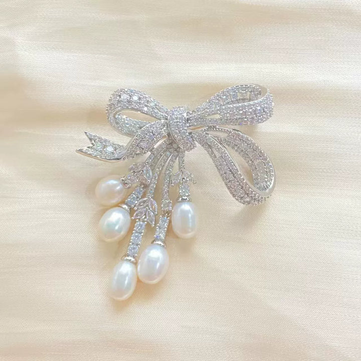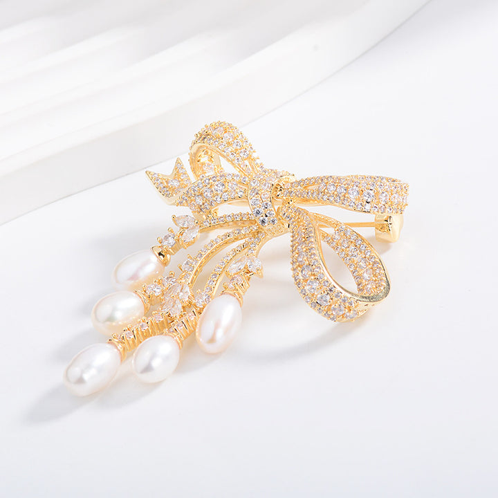 Elevate your accessory collection with this exquisite zirconium-inlaid bow pearl brooch. Expertly crafted, the brooch combines the classic elegance of lustrous pearls with the refined sparkle of zirconium accents, creating a sophisticated piece that complements both formal and casual attire. Its durable setting ensures lasting wear, making it an ideal choice for adding a touch of timeless grace to any outfit.