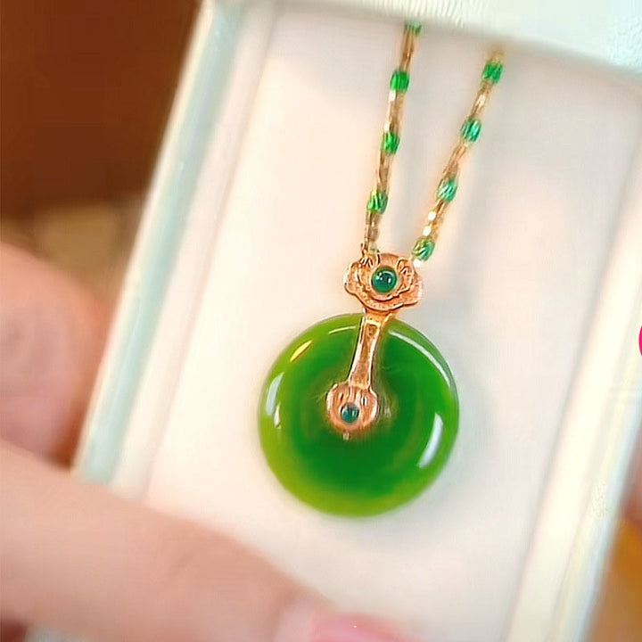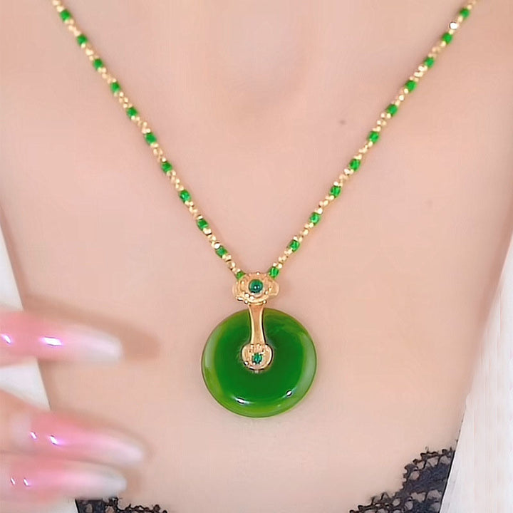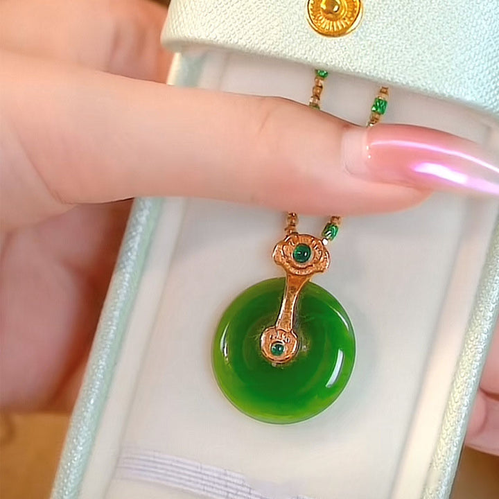 This Lucky Circle necklace features a natural emerald jade stone, handcrafted with its unique design. Its perfect size and shape make it a fashionable accessory that adds a touch of elegance to any outfit. The natural jade stone adds richness and depth, providing an attractive and unique look.